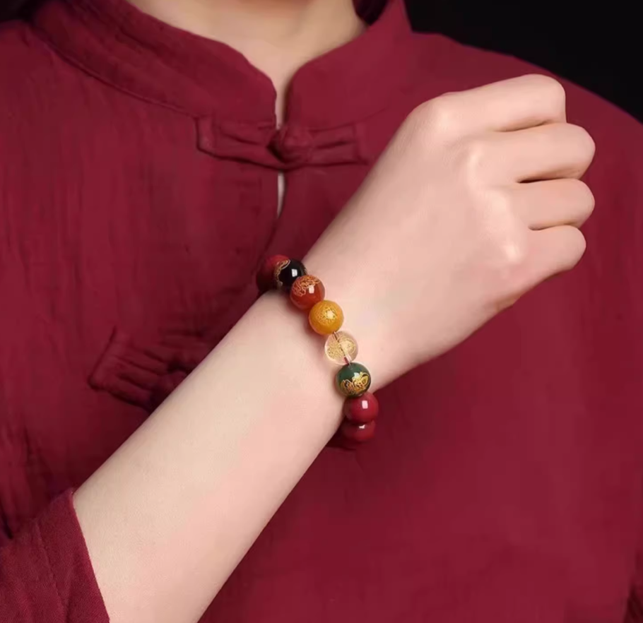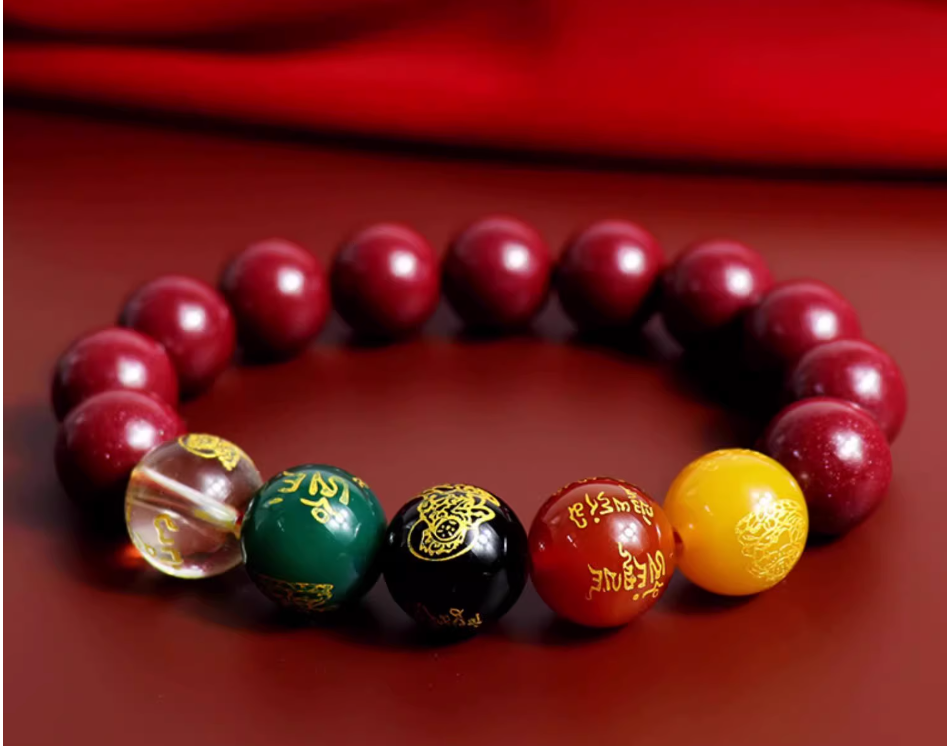 The beads in the bracelet are made of vermillion. In addition to this, there are 5 beads representing the five gods of wealth. These beads are from the Wutai Mountain in Shanxi, a holy place of Buddhism in China, and each string has been enlightened by a master.